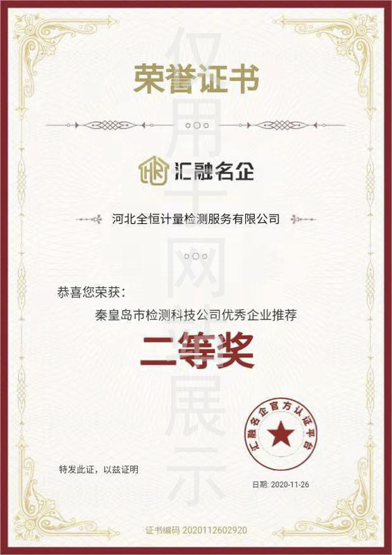 秦皇島市檢測科技有限公司優秀企業推薦二等獎證書