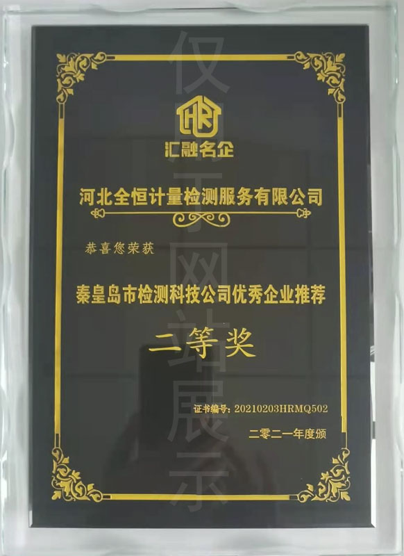 秦皇島市檢測科技有限公司優秀企業推薦二等獎銘牌